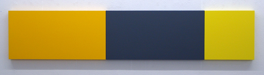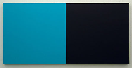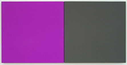 die einzelnen bildteile sind alle quadratisch, in sich ruhend. das rechte teilbild hat jeweils den dunkleren helligkeitswert, der schwerpunkt des bildes verlagert sich dorthin. die ausgewogenheit der bildflächen wird allein durch die farbintensität des linken bildteils erreicht. und augenscheinlich beschränkt sich die interaktion der flächen auf die aneinandergrenzenden kanten der zwei bildtafeln. in diesem grenzbereich wird es dunkler oder heller, die beiden farbquadrate steigern sich gegenseitig in ihrer leuchtkraft.